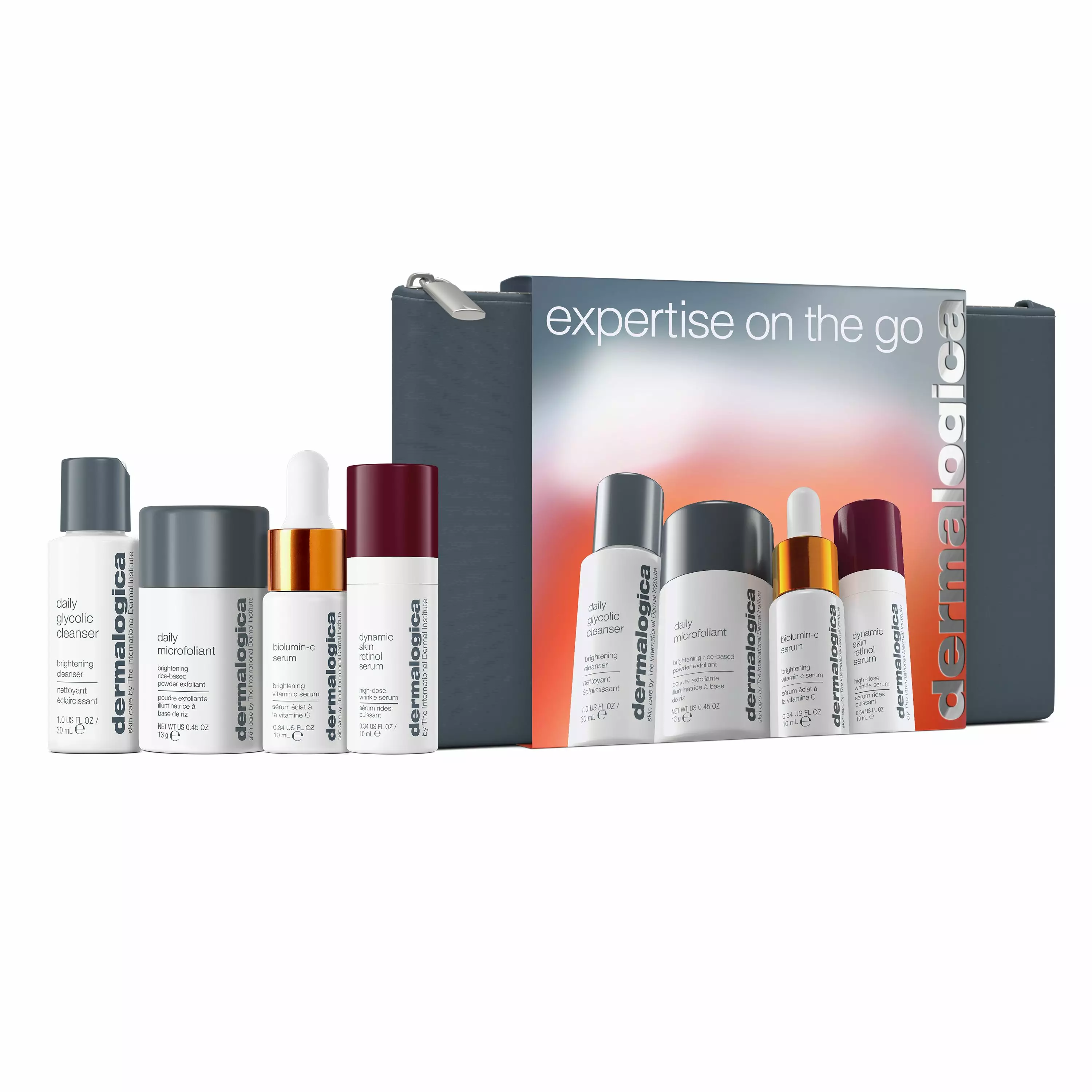 Tämä matkakokoisista tuotteista koottu setti on suunniteltu sinulle, joka haluat ammattitason hoitoa ihollesi, missä tahansa liikutkin. Jokainen tuote on huolella valittu uudistamaan ja kirkastamaan ihoa , ja yhdessä käytettynä ne takaavat täydellisen hehkun sekä sileämmän ja kiinteämmän ihon. Tuotteet ovat siis matkakokoisia ja setti sisältää seuraavat tuotteet: Daily Glycolic Cleanser 30 ml : Kirkastava ja kuoriva puhdistusaine, joka poistaa hellästi kuolleet ihosolut ja epäpuhtaudet, paljastaen raikkaan ja tasaisen ihon. Daily Microfoliant 13 g: Hellävarainen kuorintajauhe, joka kirkastaa ja tasoittaa ihoa päivittäisessä käytössä. BioLumin-C Serum 10 ml: Tehokas C-vitamiiniseerumi, joka kirkastaa, kiinteyttää ja suojaa ihoa samalla ulkoisilta haittatekijöiltä. Stimuloi kollageenin tuotantoa. Dynamic Skin Retinol Serum 10 ml : Retinoidiseerumi,joka tasoittaa ihon rakennetta, vähentää juonteita ja edistää ihon uudistumista. Mukaan saat vielä kosmetiikkalaukun, johon nämä kaikki mahtuvat hyvin reissulle mukaan! Tuotteiden arvo on 121€ - joten säästät 18% !