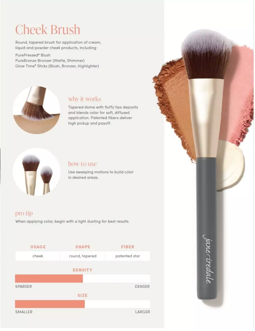 Cheek Brush on uudistettu Pro Series -sivellin ja tarkoitettu poskipunien, varjostusten ja korostusten levittämiseen. Siveltimessä on pyöristetty sivellinosa ja pitkä varsi. Pehmeät, keskitiheyden harjakset levittävät ja häivyttävät väripigmentin kauniisti. Patentoitu kuituteknologia nappaa tuotteen ilman tuotteen imeytymistä harjaksiin, tarjoten tasaisen lopputuloksen. Pitkä varsi takaa maksimaalisen hallinnan. Jokaisessa Pro Series -siveltimessämme on yksi kahdesta innovatiivisesta kuidusta: Custom PBT Blend (Pehmeä, mutta kestävä sylinterimäinen kuitu, joka nostaa tuotteen ilman imeytymistä, tarjoten tasaisen lopputuloksen) ja Patented Star (Monimuotoinen rakennekuitu, joka nostaa tuotteen tehokkaasti, minimoiden varisemisen ja maksimoiden värin intensiteetin). Uusi Cheek Brush on ylellisen pehmeä, vegaaninen ja aina eläinkokeeton.