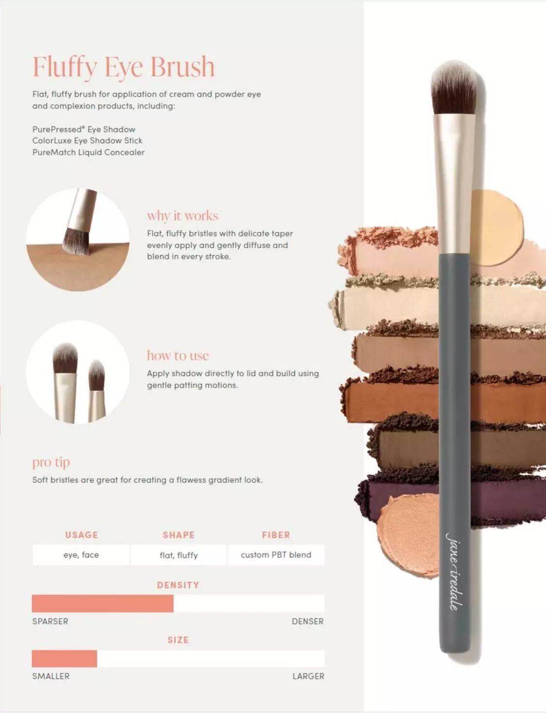 Fluffy Eye Brush on uudistettu Pro Series -sivellin ja tarkoitettu luomivärien pehmeään häivyttämiseen ja sekoittamiseen. Siveltimessä on pyöreähkö, ilmava sivellinosa ja pitkä varsi. Pehmeät, keskiharvat harjakset häivyttävät värit saumattomasti toisiinsa. Patentoitu kuituteknologia levittää tuotteen kevyesti ilman tuotteen imeytymistä harjaksiin, tarjoten pehmeän lopputuloksen. Pitkä varsi takaa maksimaalisen hallinnan. Jokaisessa Pro Series -siveltimessämme on yksi kahdesta innovatiivisesta kuidusta: Custom PBT Blend (Pehmeä, mutta kestävä sylinterimäinen kuitu, joka nostaa tuotteen ilman imeytymistä, tarjoten tasaisen lopputuloksen) ja Patented Star (Monimuotoinen rakennekuitu, joka nostaa tuotteen tehokkaasti, minimoiden varisemisen ja maksimoiden värin intensiteetin). Uusi Fluffy Eye Brush on ylellisen pehmeä, vegaaninen ja aina eläinkokeeton.